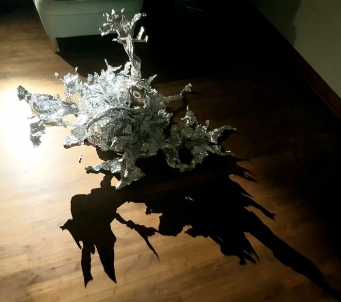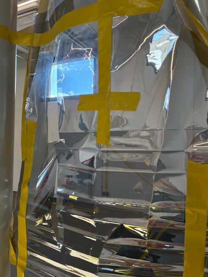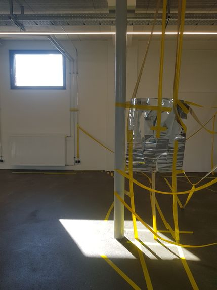 At alte Stallungen Heidelberg. Spiegelfolie, Plexiglas auf Holzsockel, Lack, weißer Holzrahmen und Tape.