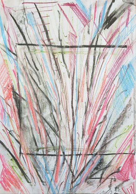 DINA4, Kohle + Buntstifte auf Papier.